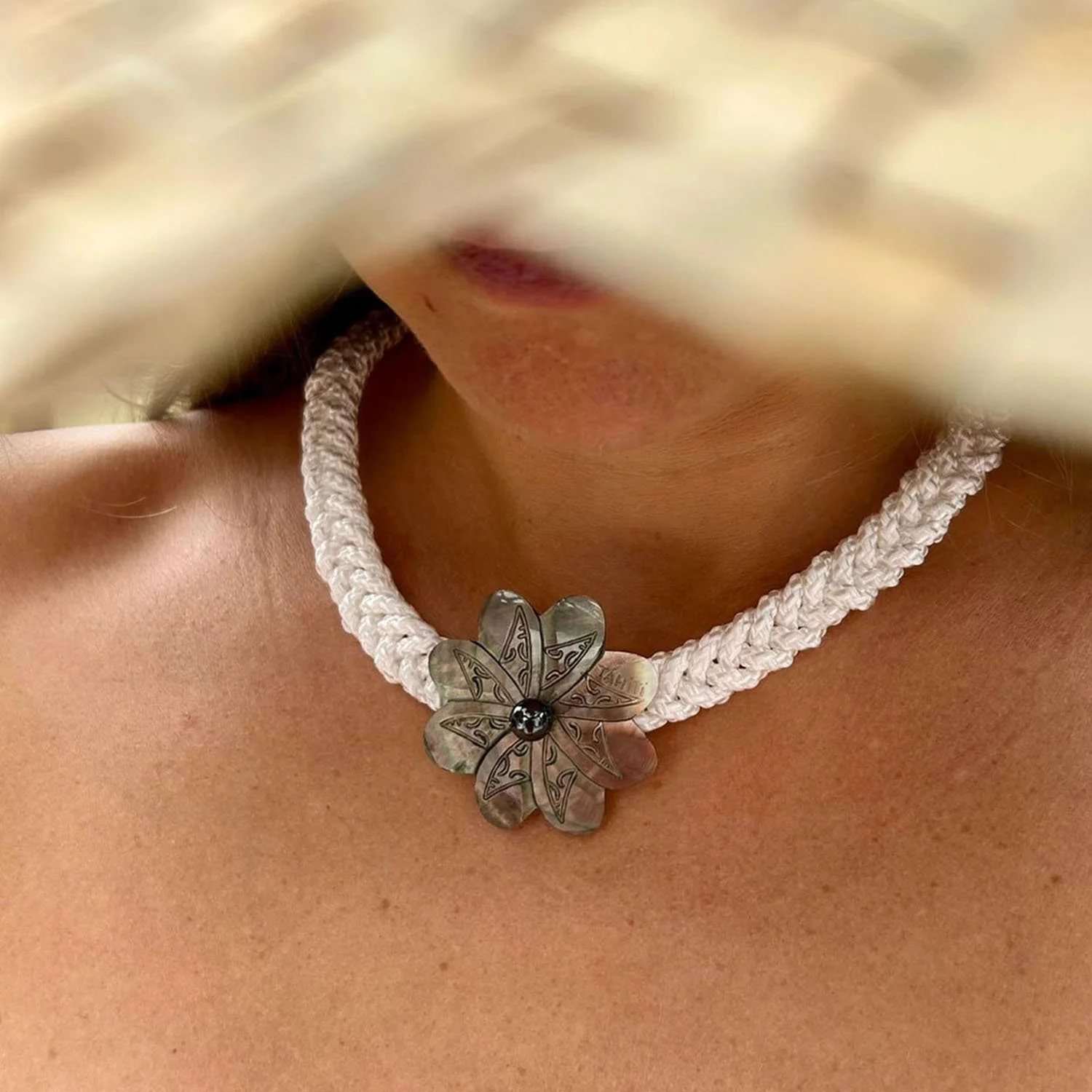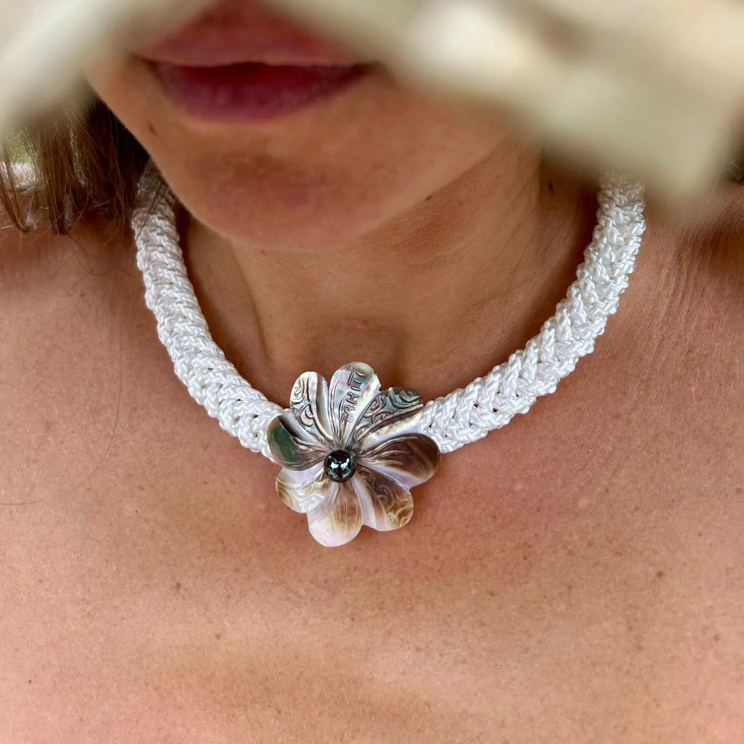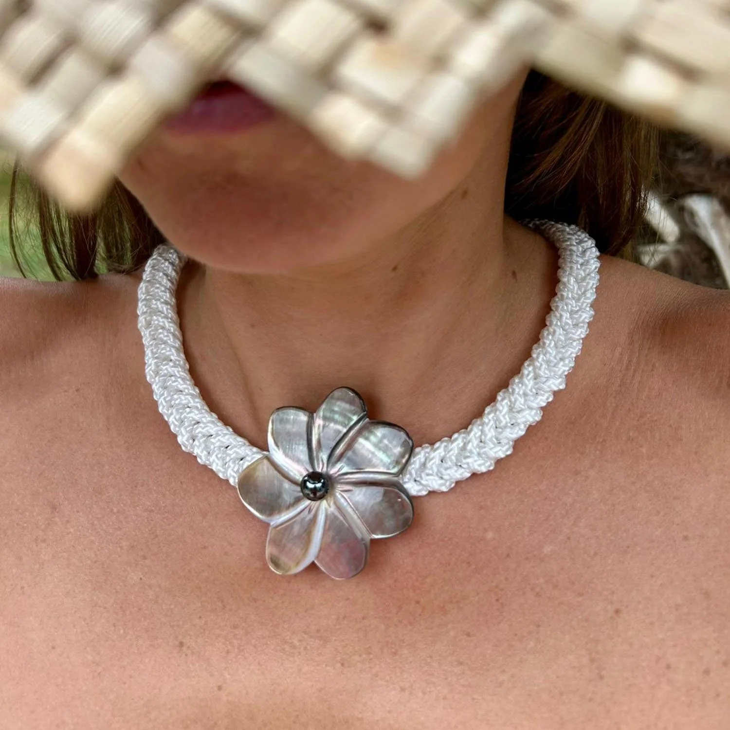 Collier tressé blanc grand hibiscus Tahiti || COT010