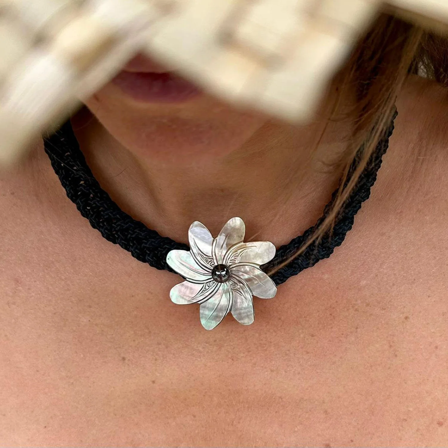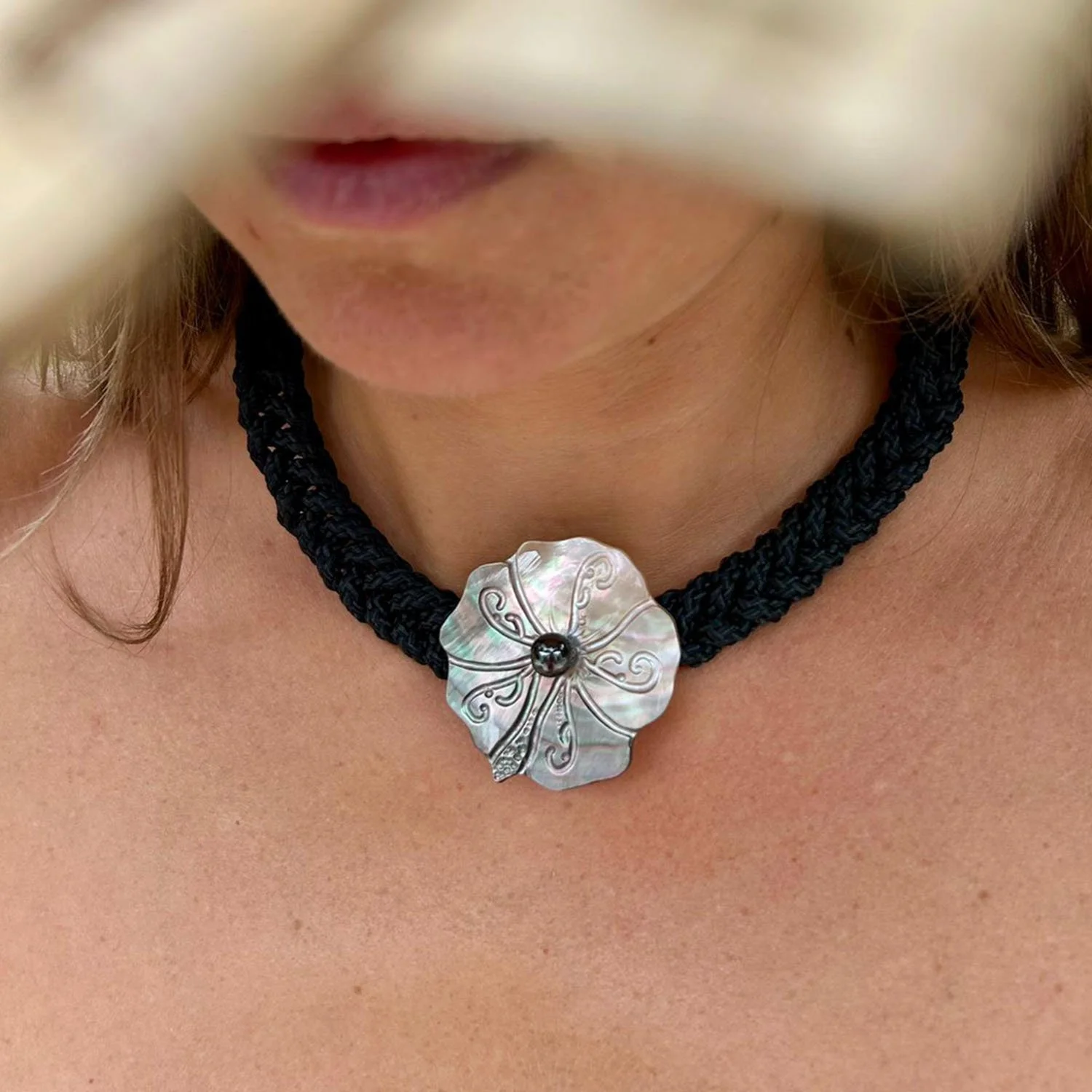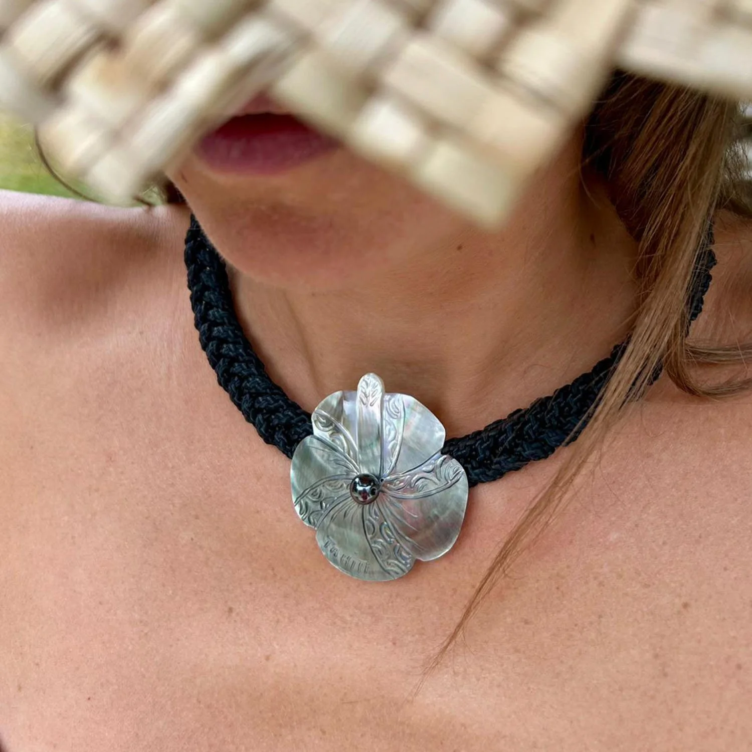 Collier tressé noir grand hibiscus Tahiti || COT009