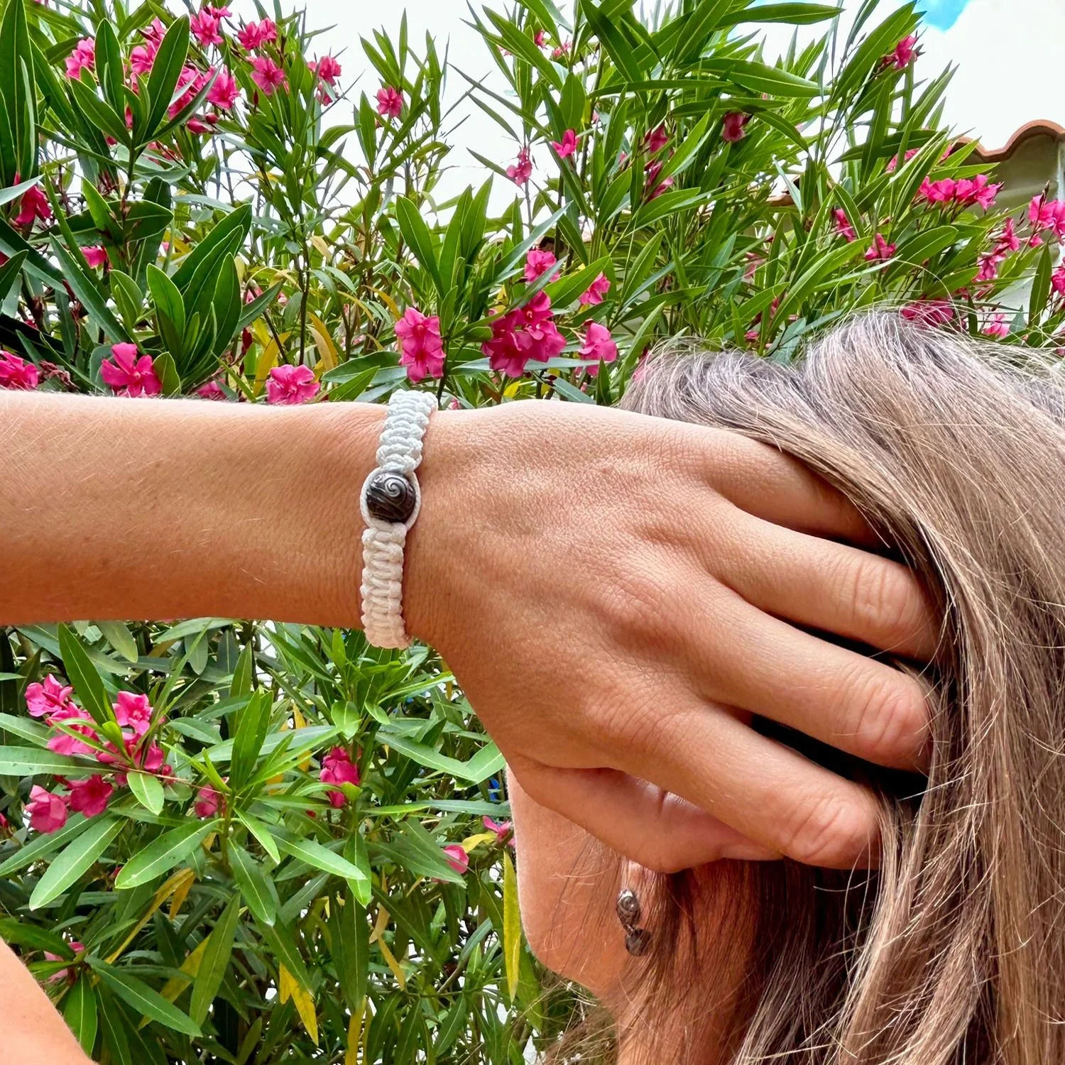 Véritable perle de Tahiti montée sur un bracelet macramé rose. La couleur et la forme de la perle sont uniques, elles peuvent donc varier et être différentes de la photo.