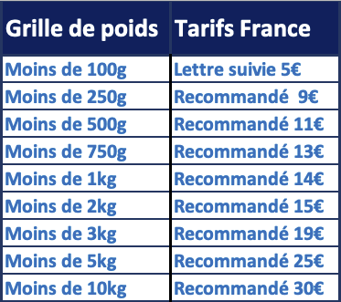 Un tableau comme celui ci-dessus , vous permet de connaître le prix des frais de port en fonction du poids des articles que vous achetez. Il vous indique :